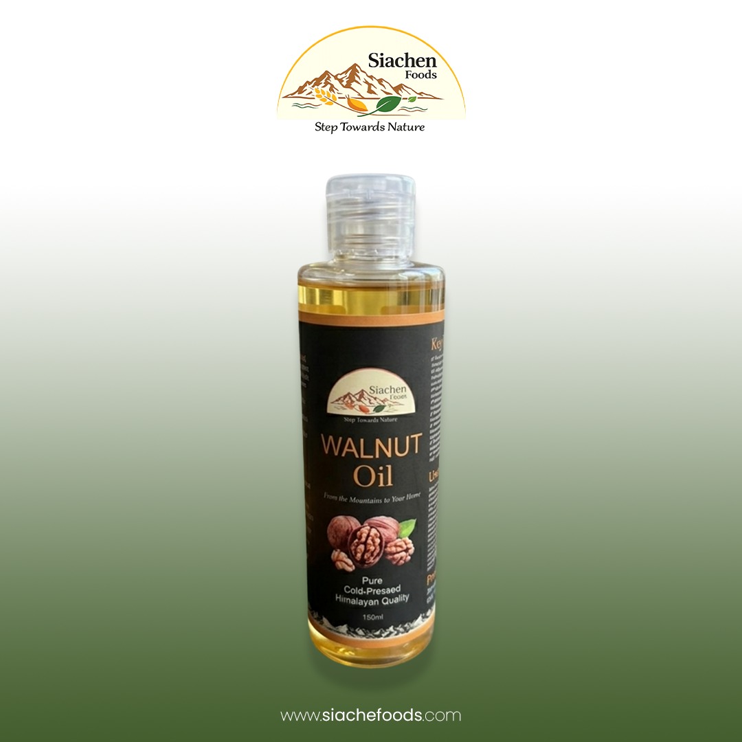 Siache Foods Walnut Oil (Akhrot Oil) is a premium, nutrient-rich oil extracted from carefully selected, homegrown walnuts sourced from the pristine orchards of Hunza Valley. Produced from trees cultivated using natural animal manure and completely free from chemicals, this oil offers exceptional purity for both internal and external use.